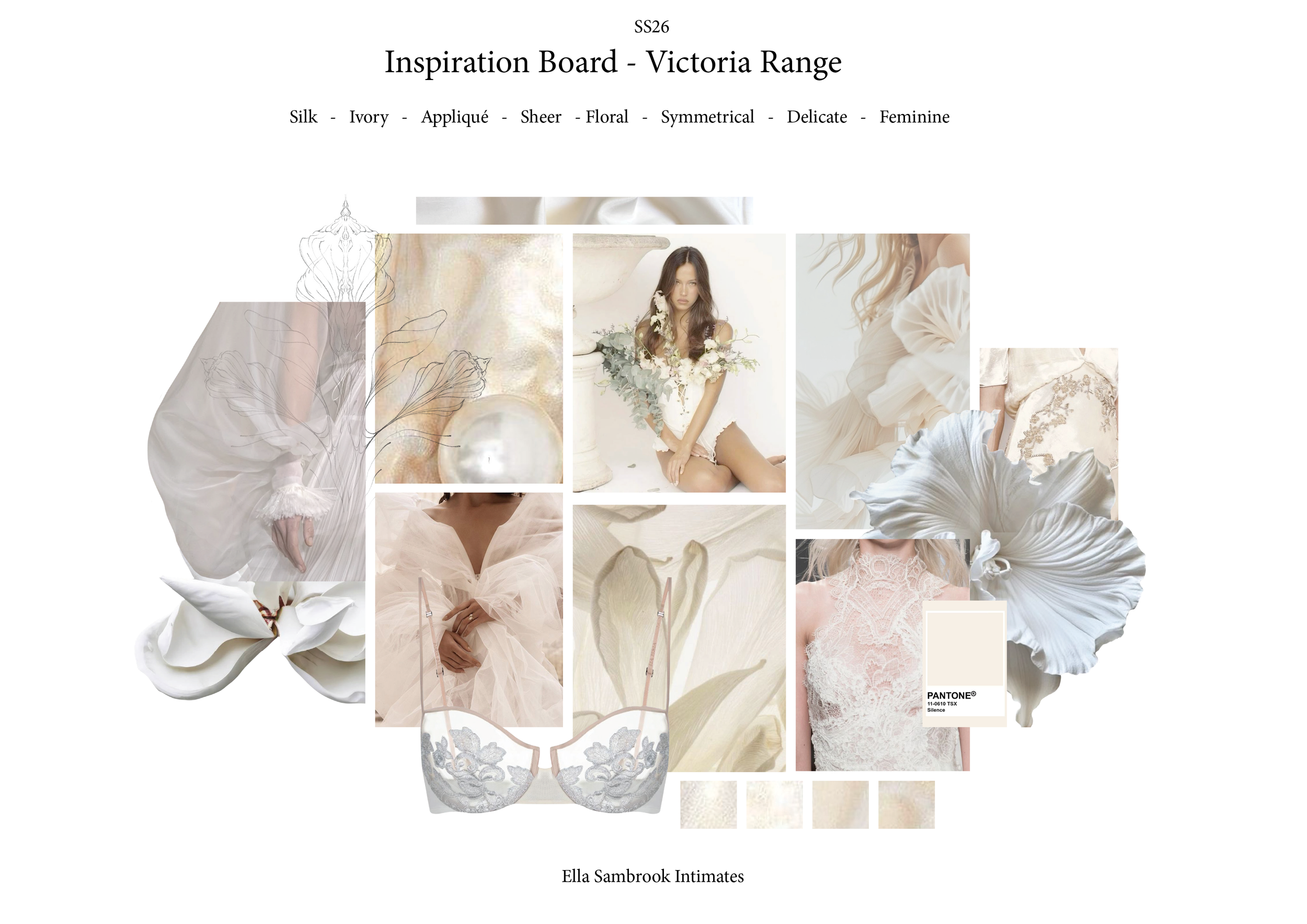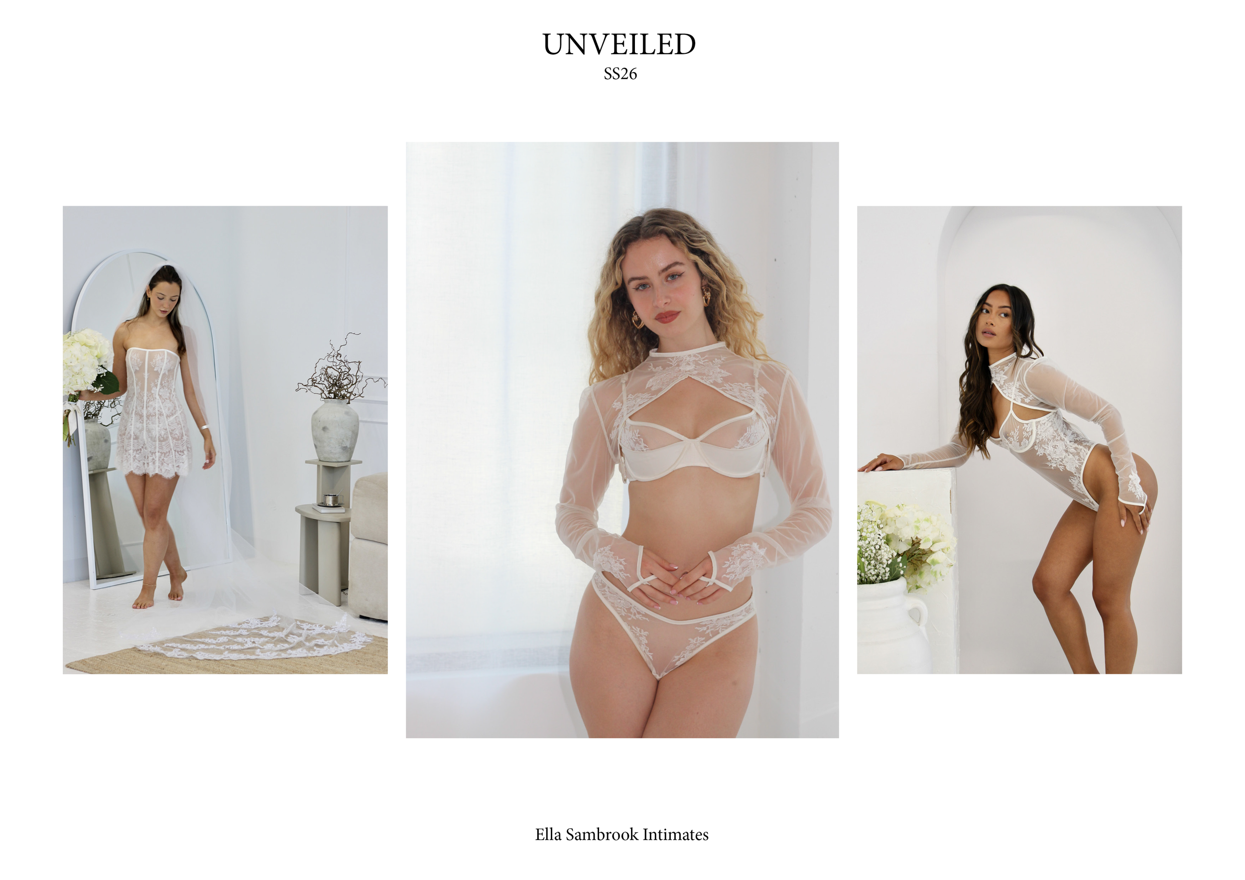 Seeking femininity in nature, this collection takes inspiration from wedding day feelings of romance, intimacy and unity. The collection explores transformation, a period of growth and the space in between. Unveiling layer by layer to reveal the body as a work of art beneath, framed and adorned by the most delicate laces.
